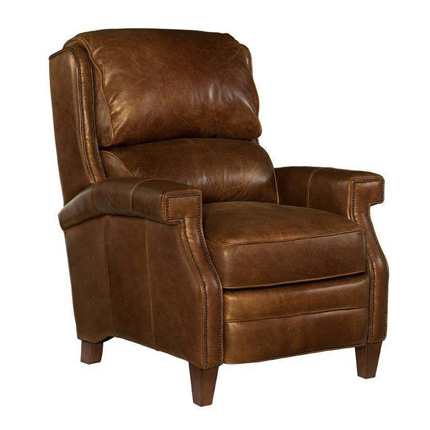 available in rich 100% top grain Epic Ten Gallon Hat Hoss leather (as shown) with Chestnut (Medium Brown) leg color and vintage hand applied nails (all pictured). This ready to ship leather club chair recliner is ideal for any room in your home. Traditional design, hand-crafted comfort and plush fiber wrapped seating.