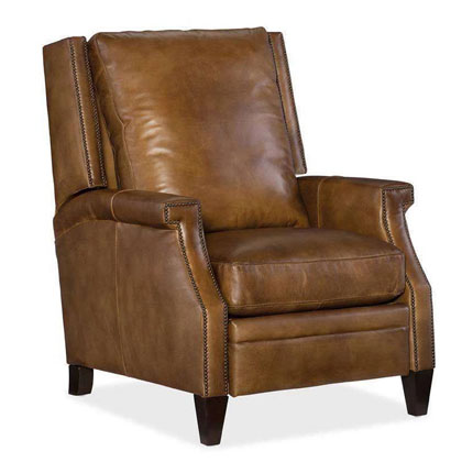 The Sylvester "Quick Ship" transitional push-back leather recliner chair measures W30.5" x D36" x H42" and features unlimited reclining positions, including TV and fully reclined. Depth when fully reclined is 68" This elegant, transitional leather pillow back style recliner is available in rich 100% top grain Epic Checkmate Pawn leather (as shown) with Chestnut (Medium Brown) leg color (all pictured). This ready to ship leather club chair recliner is ideal for any room in your home. Transitional design, hand-crafted comfort and plush fiber wrapped seating.