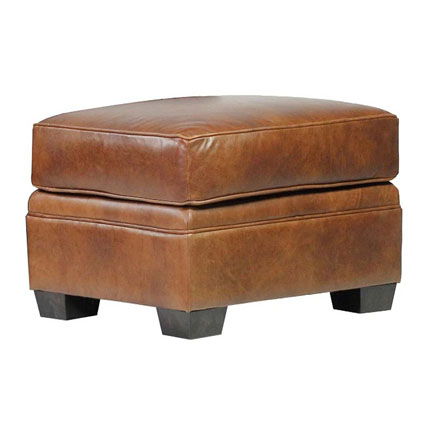 The Kingston "Quick Ship" Traditional leather ottoman measures W27" x D24" x H18" and features inlay welting detail and plush fiber wrapped pillow top. Upholstered in Luxe Gunner Coffee aniline top grain leather. This classic traditional style leather ottoman is only available in rich 100% leather (as shown) with chestnut finished legs and beautiful inlay leather welting and welted individual cushion (all pictured). This ready to ship leather ottoman is ideal for any room in your home where sophistication is a must. Classic styling and solid hardwood construction define the Kingston ottoman.