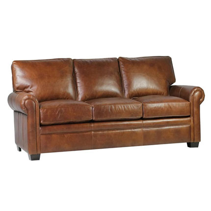 The Kingston "Quick Ship" Traditional leather sofa measures W92" x D40" x H36" and features over-size roomy seating, plush down feather wrapped seating and pleated traditional rolled arms. Upholstered in Luxe Gunner Coffee aniline top grain leather. Depth when seated is a 24" This classic traditional style leather sofa is only available in rich 100% leather (as shown) with Bombay (Coffee Bean) finished legs and beautiful inlay leather welting and welted individual cushions (all pictured). This ready to ship leather sofa is ideal for any room in your home where sophistication and comfort are a must. Classic styling, deeper seated comfort and solid hardwood construction define the Kingston sofa.