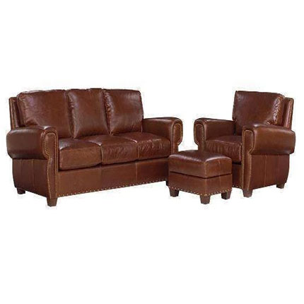 Our Weston Designer Style leather sofa set, with matching leather club chair and footstool ottoman are exquisitely designed, incredibly comfortable and a great bargain. The set includes an 86-inch-wide leather couch, matching leather armchair and leather ottoman. Our leather furniture is made from top grain leather and choice kiln-dried hardwood. The club chair and sofa have zippered and removable seats, and all 3 pieces feature contrasting nailhead trim for a distinctive and elegant appearance. You can select the burgundy leather with nailhead trim or any one of 20 different deluxe colors. We also have 2 leg color choices to help you perfectly coordinate your new furniture with existing room décor. When used as furniture trim, nails give a rich, stately appearance and dresses things up nicely without being overdone. Our club chair, ottoman and leather couch with nail head trim would make the perfect addition to either a formal living room or more casual family room. Because we handcraft our leather furniture in our North Carolina factory, we can offer our nail head leather couch set to you at extremely low prices.